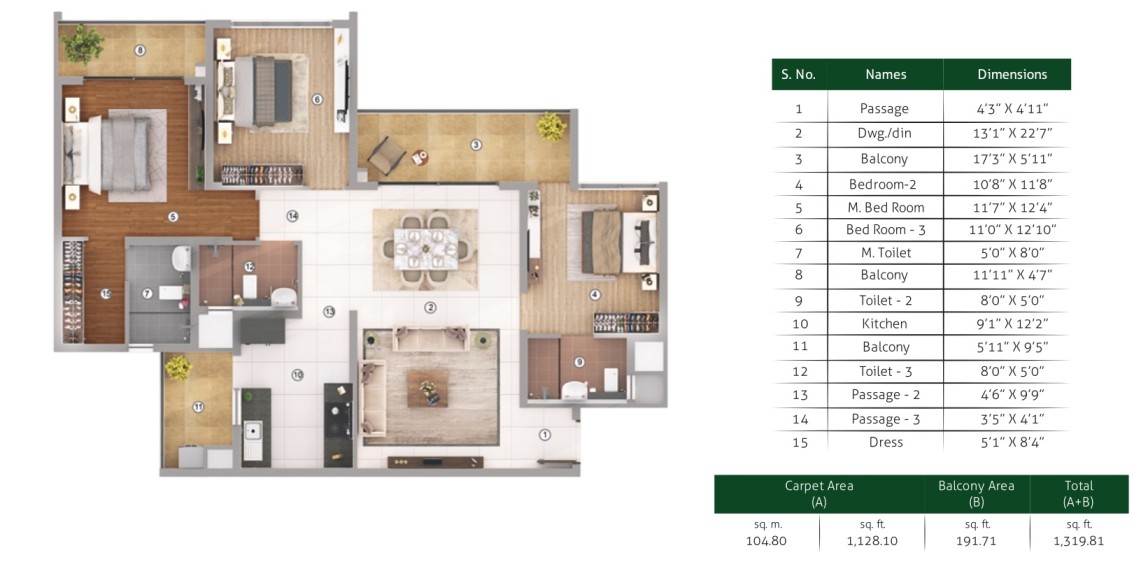 - Flooring:- Vitrified tiles of size 800mm x 800mm for living, dining and kitchen , Wooden laminated flooring for all bedrooms